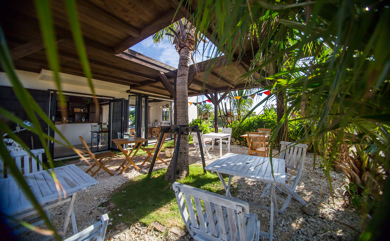 店内は白を基調とした建物に南国の植物が彩りを添え、ハンモックが設置された芝生の庭ではリゾート感あふれる時間を過ごせます。