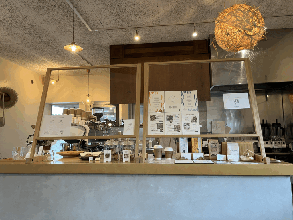 店内は白と淡い木目を基調とした明るい空間で、東京代官山を彷彿とさせるセレクト雑貨も並び、ガラス窓からの自然光が入り込む中、ゆったりとした音楽と共に洗練された雰囲気でコーヒーを楽しめます。