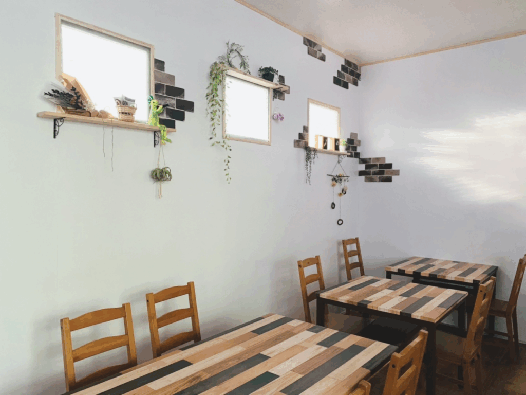 店内はカウンター4席とテーブル3卓のこぢんまりとした造りで、白壁と木目の家具に観葉植物が調和し、自然光が注ぐ温かみのある空間が広がっています。