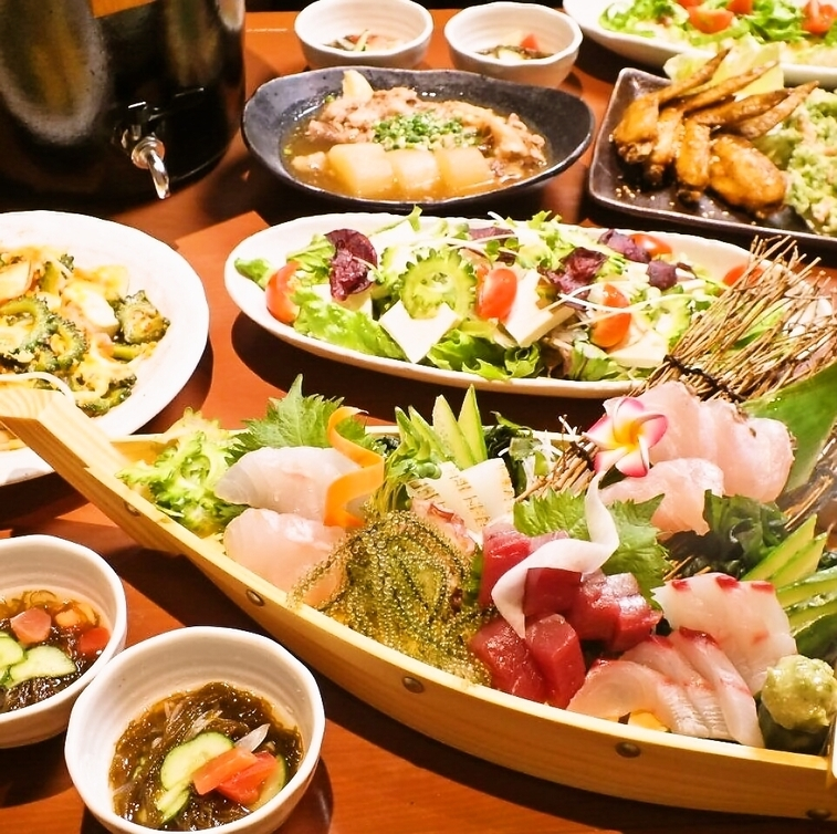 The restaurant offers a wide variety of dishes made with fresh seafood caught by its own fishing boats, including sashimi and sushi, mozuku seaweed tempura, and jimami tofu (peanut tofu), all served at reasonable prices.