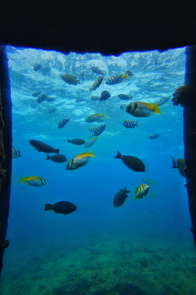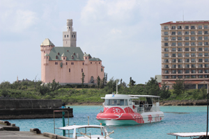「シースカイ博愛」は、船の底がガラス張りになっているグラスボートで、海に潜らなくても熱帯魚やサンゴ礁を観察できるインドア型のアクティビティ。