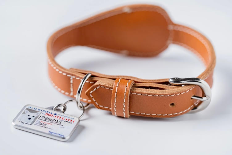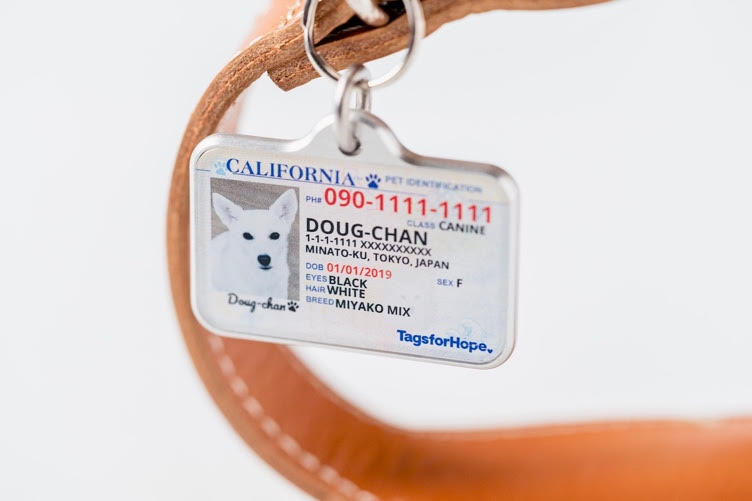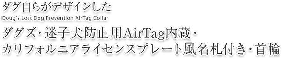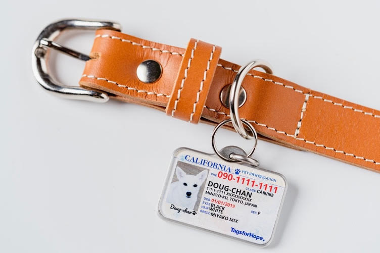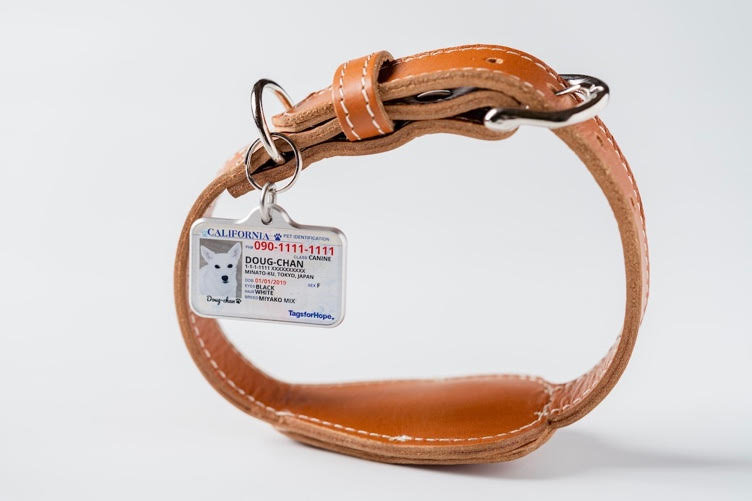 日本でも犬のマイクロチップの義務化が進んでいます。しかしこれにも問題があります。例えば、ある人がある迷子犬を見つけたとしましょう。しかしその人がその迷子犬の飼い主を探すには、その犬を捕まえて(まずこれが困難!)、動物病院に連れて行き、そしてマイクロチップを読み込む必要があります。この忙しい現代、そこまでしてくれる人が何人いるでしょうか? そこでダグはこの首輪に飼い主の住所と電話番号がはっきりと書いてあるカリフォルニアライセンスプレート風名札をつけました。これであればそんなに手間もかからずに飼い主に電話をすることができます。(名札の発送には2ヶ月ほど頂きます)
