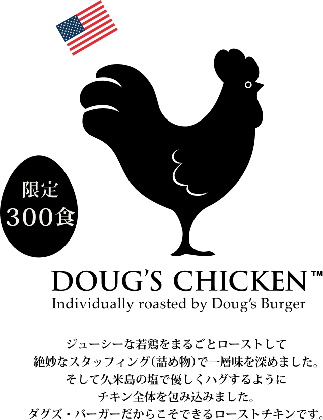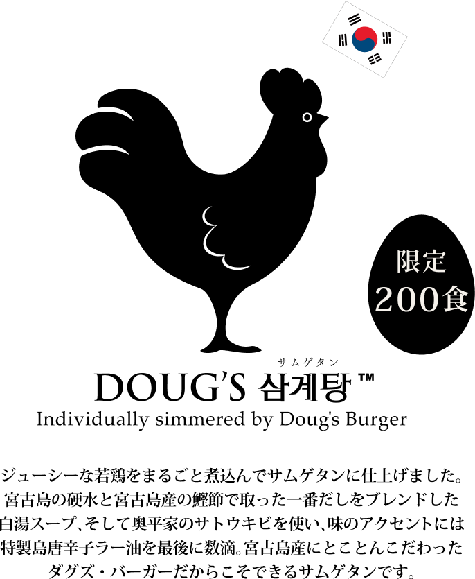 2012年12月。閑散としたダグズ・バーガーの店頭で、ダグが目にしたのは某有名チキン店にできた長蛇の列。「そうか、12月はチキンか!」とひらめいたアイデアが、年に一度だけ味わえるご褒美のダグズ・チキンです。初年度はジューシーなローストチキン。そして、数年後、旨みがしみ込む本格サムゲタンもラインナップ。一年に一度、ホリデーシーズン限定。あなたのテーブルに宮古島からのご褒美をお届けします。