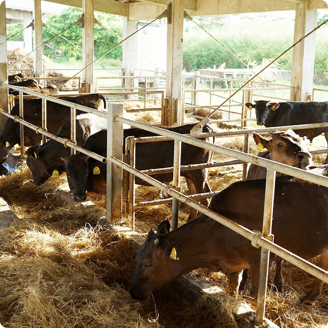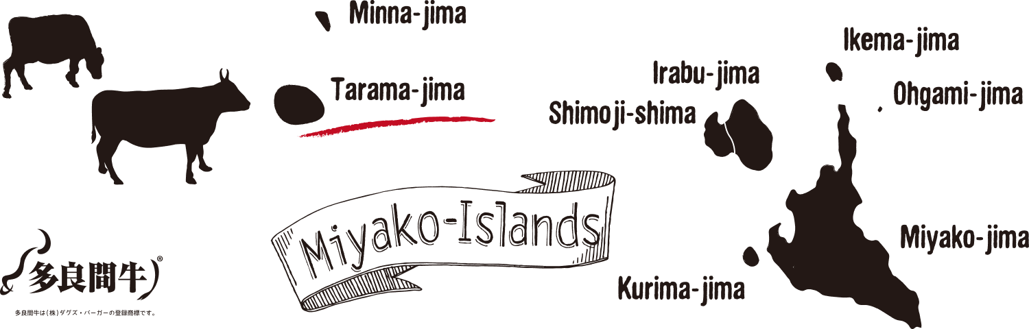 多良間島は、宮古島から西へ67キロ、島一周15キロ、標高は最高でも海抜30メートルというほぼ完全に平坦な小さな島。そんな多良間島の人口は1200人、しかし飼育されている牛は5000頭という、黒毛和牛の名産地です。ダグズ・グループで使用されている牛肉は、この多良間島で南国の潮風を感じながら産まれてきた牛の肉です。